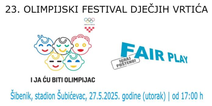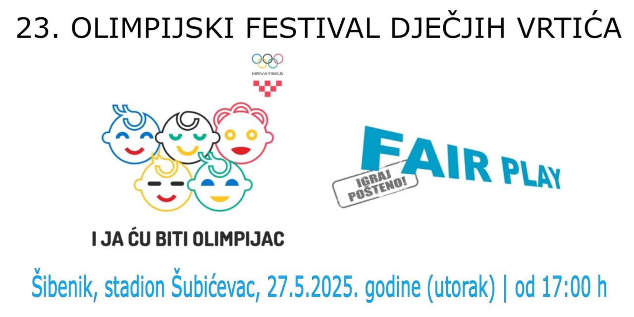 U utorak 27.5.2025. godine na stadionu Šubićevac od 17:00 sati održati će se 23. tradicionalni Olimpijski festival dječjih vrtića u organizaciji Zajednice sportova Grada Šibenika, a pod pokroviteljstvom Hrvatskog olimpijskog odbora. Više od 500 djece iz šibenskih dječjih vrtića Brat sunce, Žižula, Blažena Hozana, Sunce, Osmijeh, Smilje i Maslina natjecati će se u nogometu (muškom i ženskom), skoku u dalj, trčanju na 50 metara, bacanju loptice te u štafeti 4×25 metara.