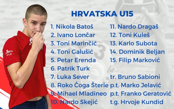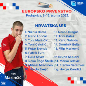 Glavni grad Crne Gore, Podgorica bit će domaćin Europskog prvenstva za vaterpoliste do 15. godina. Hrvatska se nalazi u skupini Srbijom, Grčkom i Turskom, a prvu utakmicu Hrvatska igra u nedjelju protiv Srbije od 21:00 h. Izbornik Hrvatske, Šibenčanin Bruno Sabioni objavio je jučer konačan popis putnika na EP, a među 15 pozvanih igrača svoje mjesto je pronašao i igrač Solarisa Toni Marinčić. Europsko prvenstvo počinje sutra i trajat će do 16. srpnja.